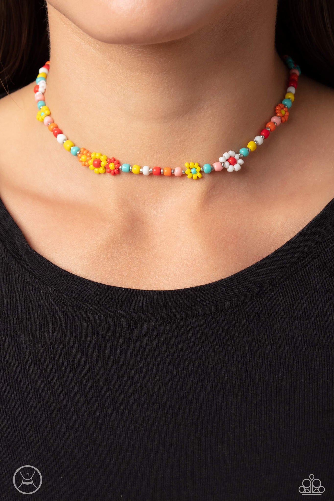 Multicolored seed beads and silver accents are threaded along a wire, falling along the collar in a capricious pattern. Creating additional charm to the design, white, yellow, turquoise, orange, red, and light pink seed bead flowers in varying sizes blooms amongst the bright pops of color. Features an adjustable clasp closure.