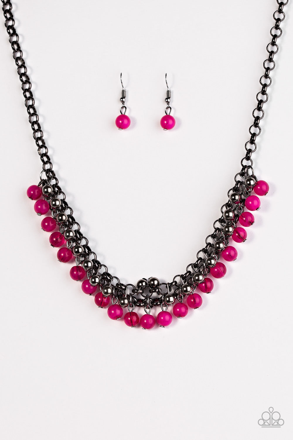 Rows of gunmetal and pink beading cascade from interlocking gunmetal chains, creating a stacked fringe below the collar. Features an adjustable clasp closure.