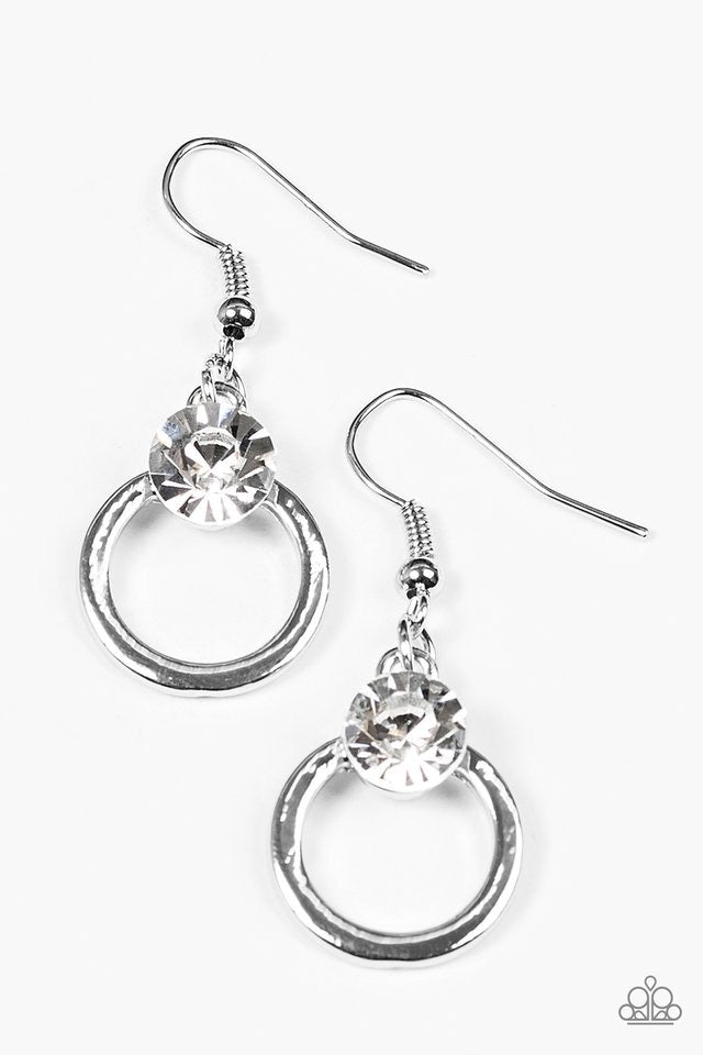 An oversized white rhinestone crowns the top of a glistening silver hoop for a refined look. Earring attaches to a standard fishhook fitting.