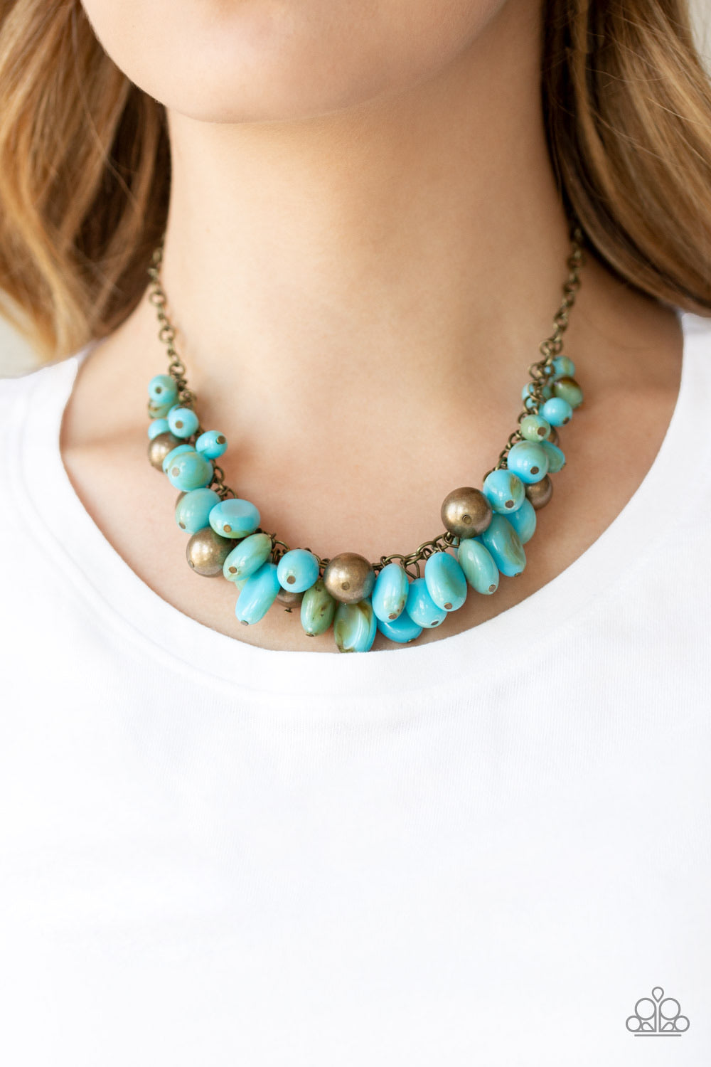 Featuring a smoky finish, a collection of blue acrylic beads and antiqued brass beads dangle from a classic brass chain, creating a flirtatiously clustered fringe below the collar. Features an adjustable clasp closure.