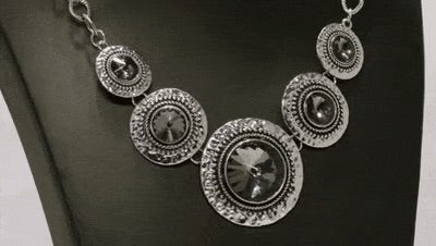 Gradually increasing in size, dramatically oversized smoky gems are pressed into the centers of hammered and silver studded frames. The blinding frames link below the collar for a glamorous, statement-making finish. Features an adjustable clasp closure