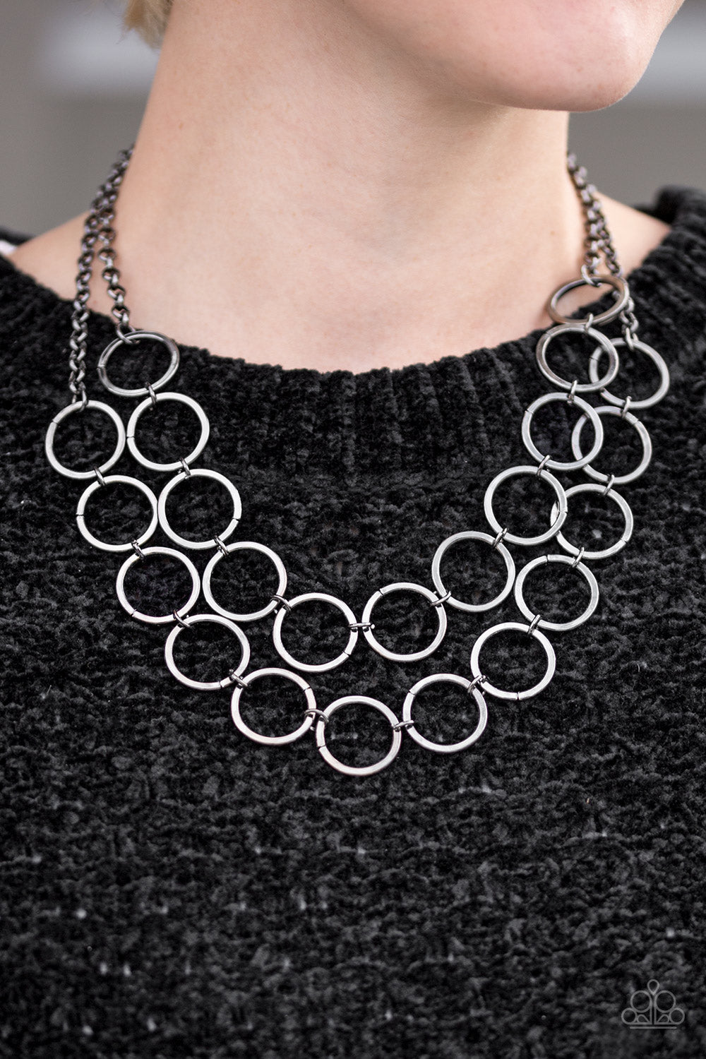 Two rows of bold gunmetal hoops link below the collar in edgy layers. Features an adjustable clasp closure.