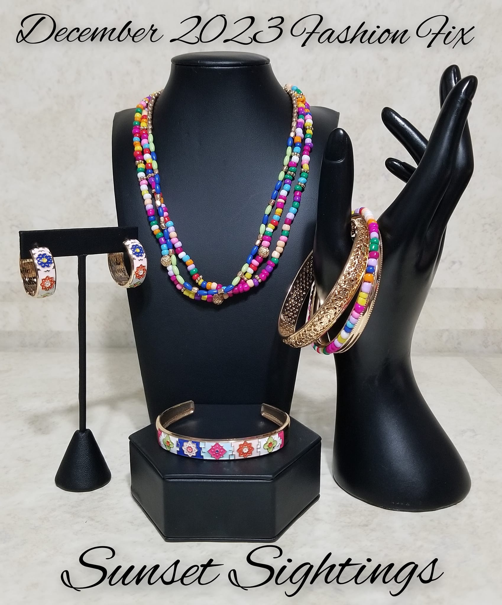 Includes one of each accessory featured in the Sunset Sightings Trend Blend in December's Fashion Fix: